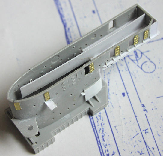 •The locating tabs on the flag lockers (F17) were removed, the undersides filed horizontal and the bottom opening covered with thin styrene sheet. This was also used to make the canvas covers on the tops.