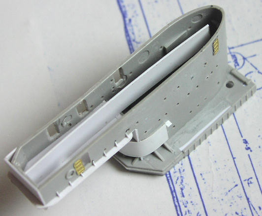 •There is an incorrect angled cut-away on the port forward corner of part E1 and three scuttles in the forward bulkhead (part E18) which should not be there. Both these were corrected by overlaying with thin styrene sheet.