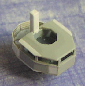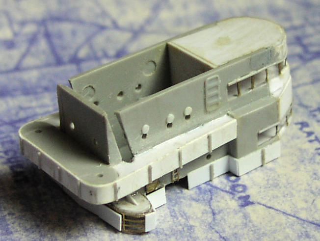 •The angled front was sawn off parts E11 and E12 and an internal bulkhead added aft of the remaining windows to maintain the width of the structure. The roof of the flag plot (E20) was shortened by the same amount as the sides.