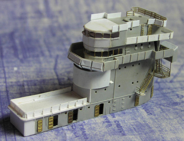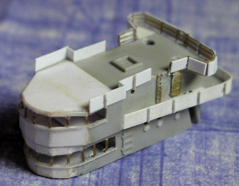•New decks cut from styrene sheet and with the correct angled facets around the front edges were fitted at pilot house and flag plot deck levels and at flag plot roof level. The angled fronts were cut from photo-quality paper, scored, angled and glued in position. Window stiles were cut from PE railing.