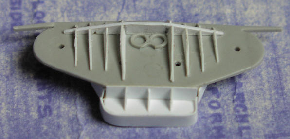 The base of the structure (kit parts C1 and C2) is accurate in dimensions and for the position of doors and scuttles. However, both parts are incorrectly joggled outwards near the aft end. On the inboard side this additional width would overlap part of the torpedo elevator in the flight deck. The joggles were easily corrected and C1 and C2 made flush. This was done by cutting, trimming and recementing, making adjustments for length on C1 by reinforcing the inside and inserting styrene strip in the resulting gap. The aft bulkhead (part C18) was reduced in width to fit and the scuttle holes filled.