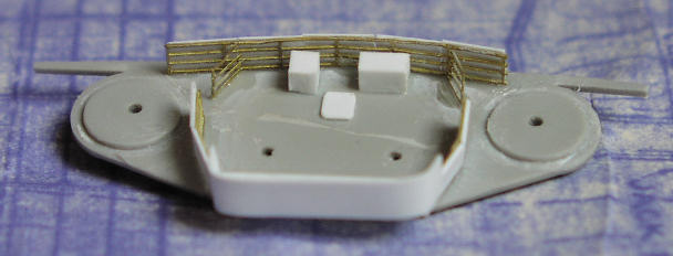 All moulded detail on the top side was removed and the platform filed smooth (apart from the two circular platforms for the 5-inch range-finders at the outer ends). Replacement shielding and life rails are best understood by reference to the photograph. I used styrene strip to represent the splinter mattresses hung from the rails.