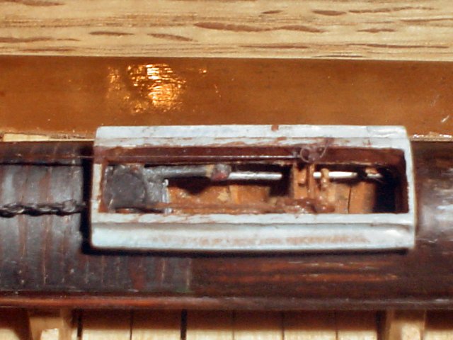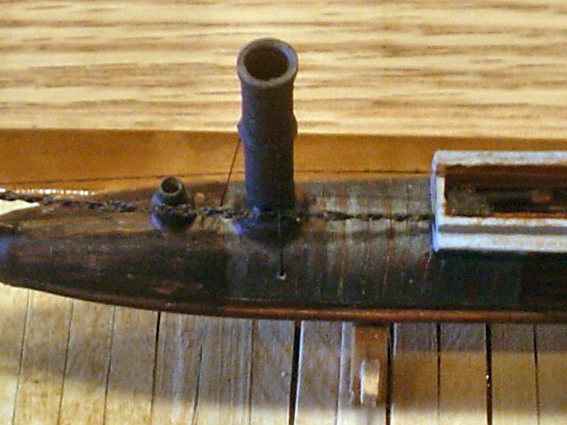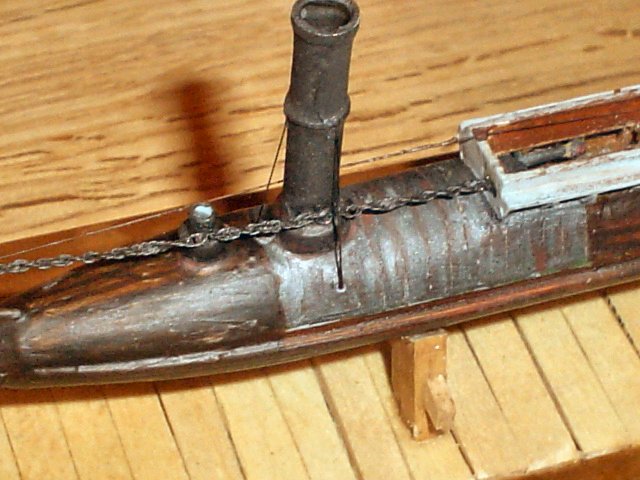 The left over photo-etch brass parts tree from my Palmetto State formed the brass ring at each end of the boat (mentioned before), the two bladed propeller, the interior floor and the chain left over from the Palmetto State gun ports for raising and lowering the spar torpedo. Brass and aluminum tubing made up the smoke stack, air vents fore and aft, spar torpedo pole, and sold brass rod for the spar torpedo mounting supports.