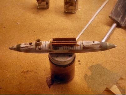 The forward and aft end of the boat was shaped by using the nose and tail of a 1/72 AGM-12 Bullpup Missile from Hasagawa weapons set glued on and then shaped with putty and sanded.