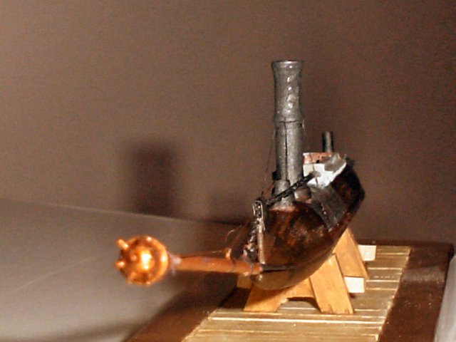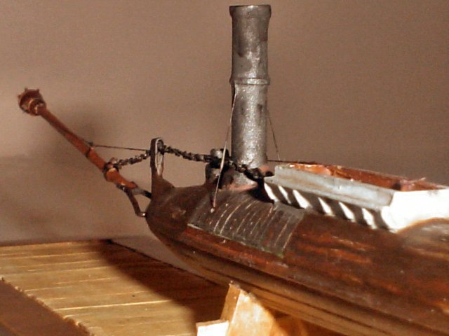 After the fore and aft brass rings were installed, which separates the wood hull from the sold wood fore and aft sections; I cut two more ribs to run the longitudinal side rails down each side. The ships steering wheel was made with plastic rod, and stretched sprue. I used a highly modified cover plate from the side of a Testors 1/35 scale M4 Sherman tank for the boiler face, along with wheel hubs for the main boiler body. Tin solder formed the steam lines from the boiler.