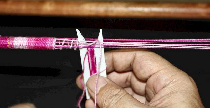 After making about 8 weaves, I take the pencil out and use the shuttle tool to push the weave in. You can also do this by hand along with the help of the shuttle tool to push. Make sure that the strings are aligned before you do this step.