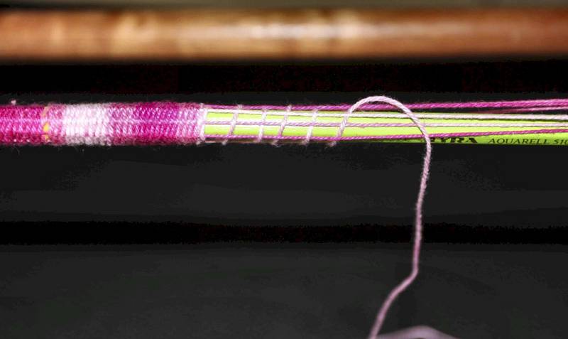 The green pencil, I selected to allow me to see the cord much better while weaving. It also serves the purpose of keeping the size of the fender consistent throughout the weaving process. As you weave, you can rotate the pencil to see the strings on the other side of the pencil, or rotating one of the wooden bases will also do the trick. The colored pencil also allows me to see if my weave pattern is correct. As you can see, I made several weaves at varying distances to make sure the pattern is correct.