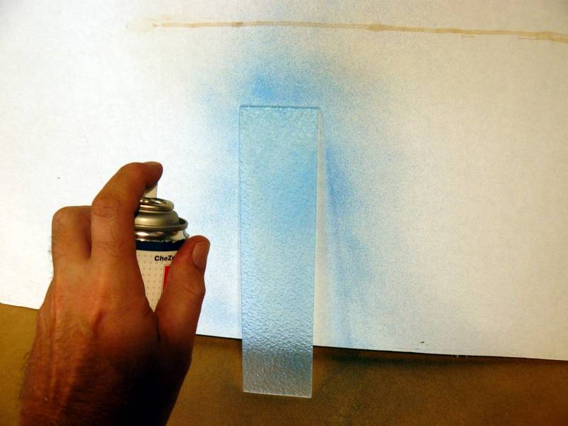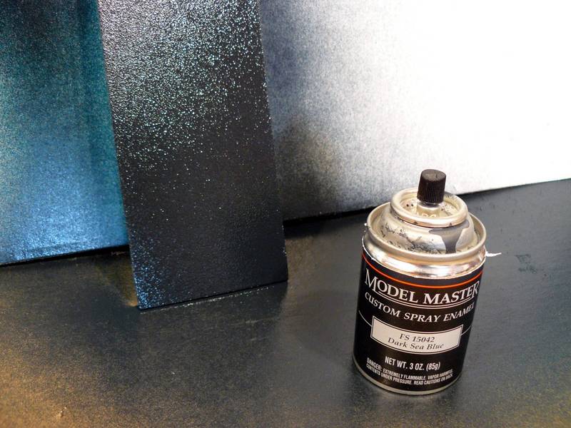 After the first color has dried I spray a very dark color over it. Here I am using TESTORS’ Model Master Dark Sea Blue, but you could use black as well. I have found that the super glue will show through the lighter color during the next step of attaching the OEP to the black display case base. This darker, and final, color will prevent undesired black spots from the super glue showing through the OEP, later.