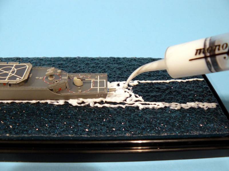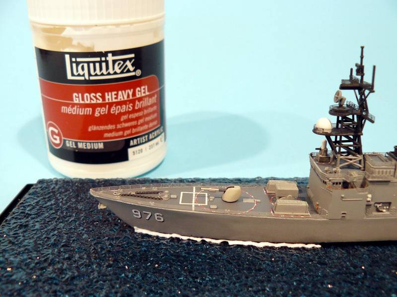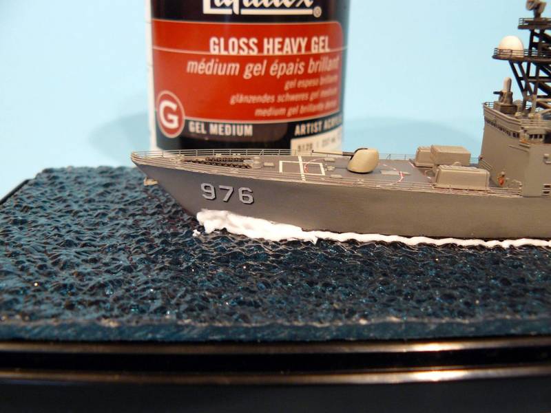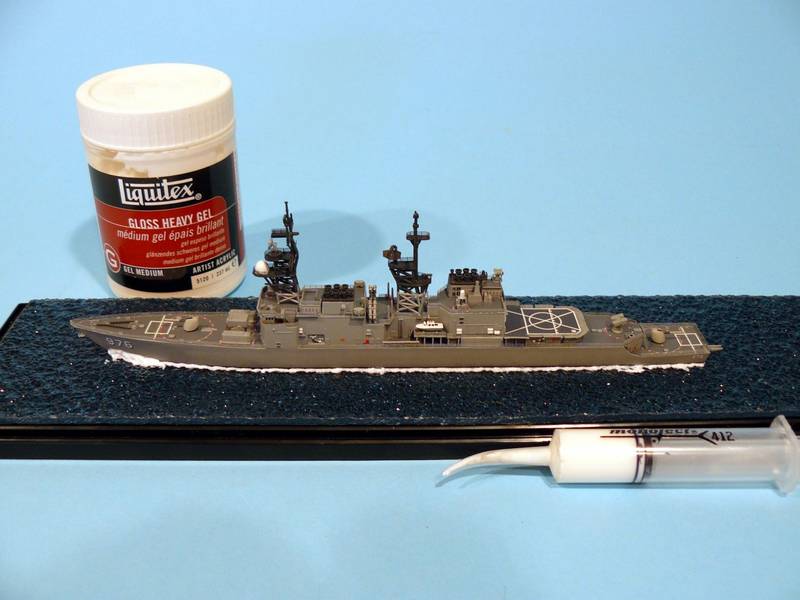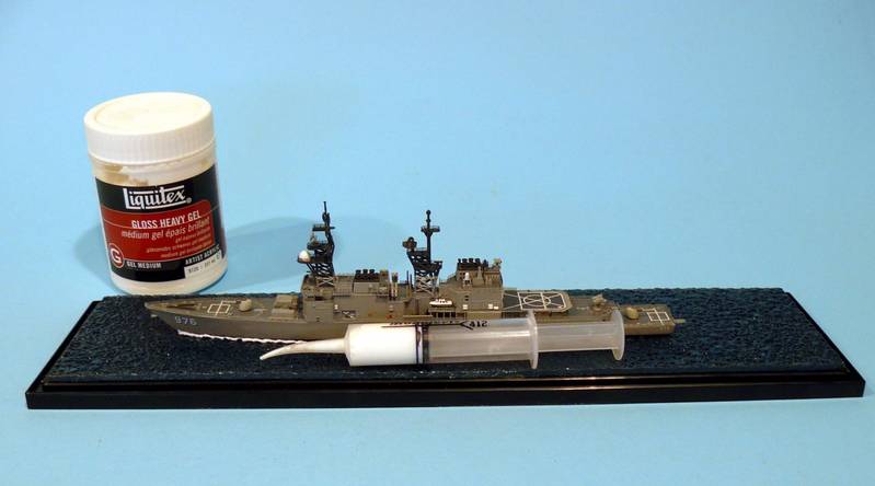With a hobby syringe filled with LIQUITEX Gloss Heavy Gel (an artists’ canvas preparation acrylic gel), I fill the gap between the model and the OEP that occurs because of the irregular surface of the OEP and the straight edge of the model’s hull.During this same step, I apply the first layer of the bow wave. The bow wave needs a number of layers to build up its dimensions for a more realistic look.