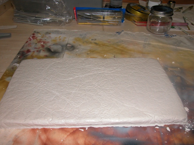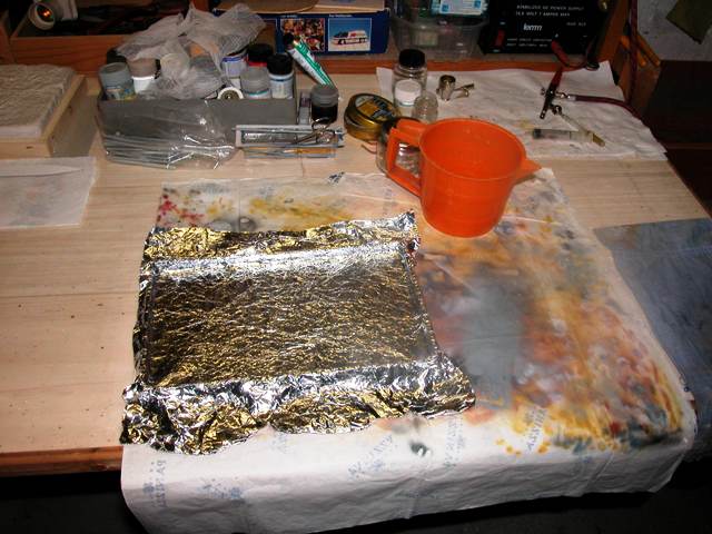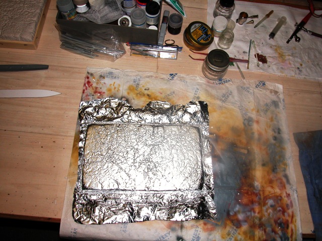 The base is a mix of two different techniques.The massive part (water) is made of plaster, poured into a mold coated by a kitchen aluminum foil, wrinkled and then stretched. This technique is described by Omami in the Tech Tips section of the IPMS Stockholm website (www.ipmsstockholm.org). When upside down, the plaster surface in contact with the aluminum foil reproduces a slightly choppy sea.