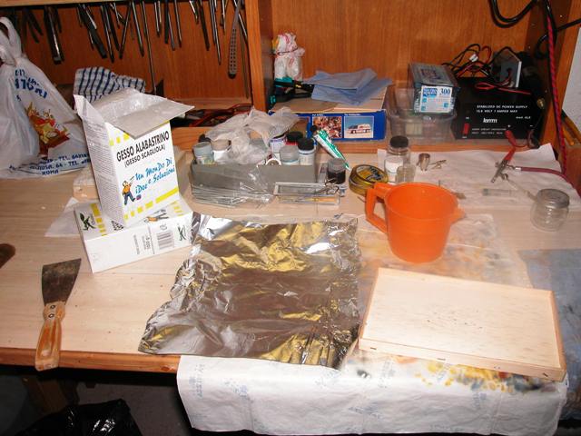The massive part (water) is made of plaster, poured into a mold coated by a kitchen aluminum foil, wrinkled and then stretched. This technique is described by Omami in the Tech Tips section of the IPMS Stockholm website (www.ipmsstockholm.org). When upside down, the plaster surface in contact with the aluminum foil reproduces a slightly choppy sea.