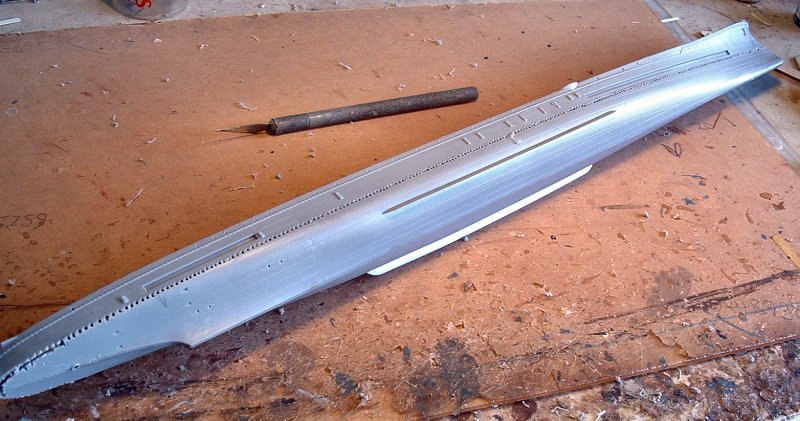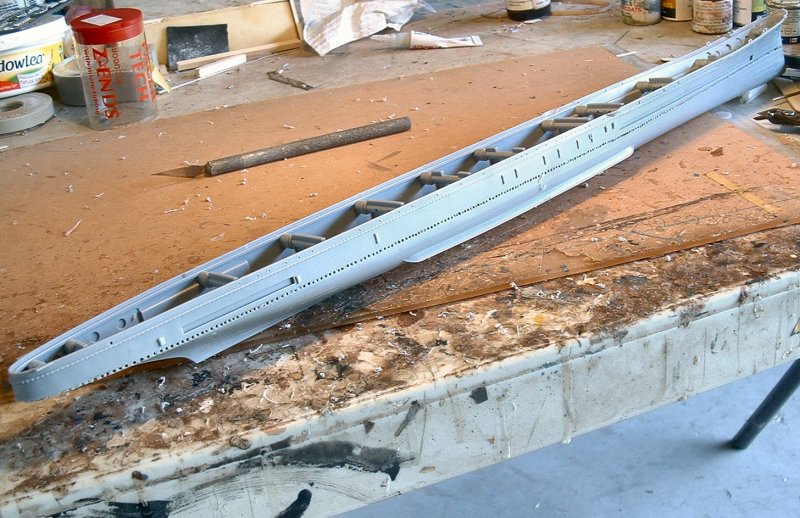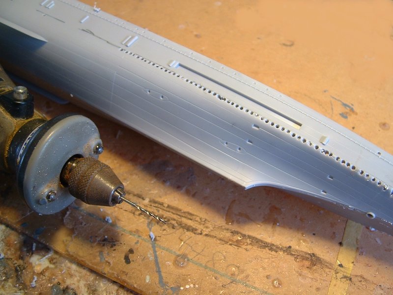 This process is the most critical and the most boring. Using a 1mm drill bit, I drill holes the entire length(under the water-line) of both sides of the hull, using an X-acto knife to 'lathe' off any build up of melted plastic that appears on the drill bit. Any build up of melted plastic will make the hole too big and extend over the cut line. Each holes outer diameter must not extend above the water-line, so great care is needed. I space my holes apart, the same diameter of the drill bit, 1mm.