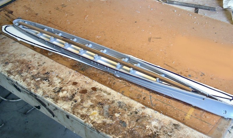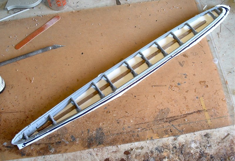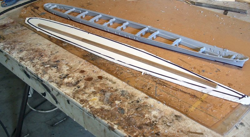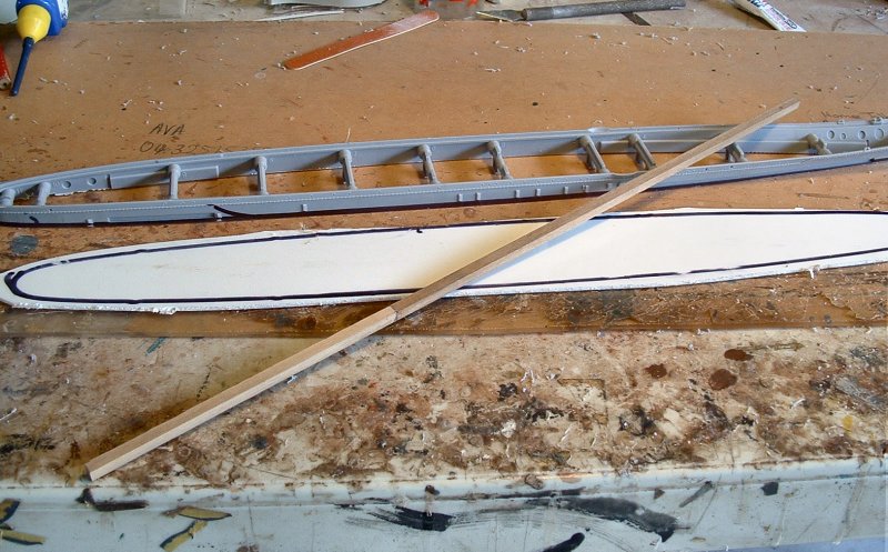 Using a dead flat hard surface, I fit the base plate stiffener into the hull brace cutout slots and sit this onto the base plate. Here I will add a few drops of superglue along the wooden strake and base plate, fixing it into position. Once set, remove the hull and run superglue the entire length of the strake.