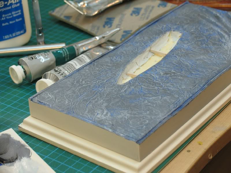 I let this dry before adding blue-gray all over, making sure that this color would NOT go into the recesses. This is easily achieved by making sure to use the paint undiluted right from their tubes.