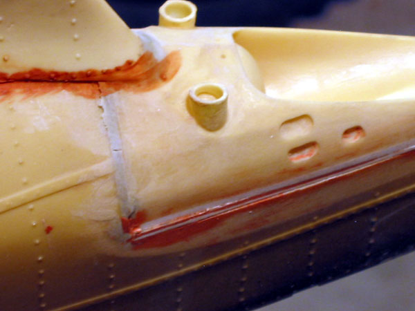 11/25/05 finds me awake at 4:30am in hopes of finding a TV for my son for Christmas. I am lucky to have escaped Wal-Mart with my life by 5 am. Never again will I do this. I have to work today, but that is another 4 hours away. There’s plenty of time to get some more building accomplished on the “Uber-sub. “ I cleaned up the putty I applied yesterday with most of the work revolving around the very tail end of the boat where a large resin plug attaches. This plug is part of the attaching point for the rudders and tail planes. Initially it fit like crap, but after several shims, lots of putty, and copious amounts of colorful words, it looks pretty good. I lost a fair amount of rivet detail due to the heavy sanding required to blend everything in. I will replace as much as I can without losing my sanity.