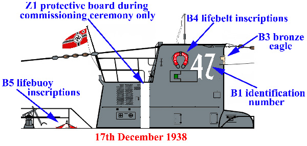 A number of pre-war features are evident in this photo of U 47 during her Indienststellung (commissioning ceremony) on the 17th December 1938. The paint is fresh since all U-boats received a fresh coat of paint for their commissioning ceremony. Note that there was no spray defector midway up the front of the conning tower at this time.