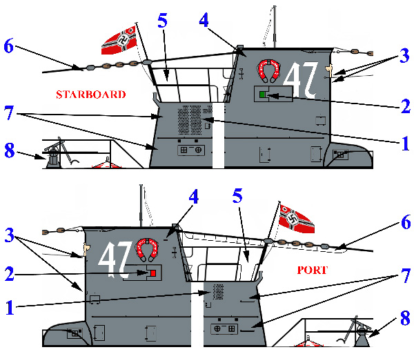This drawing illustrates the differences between either side of the original tower of U 47. The numbers indicate the following differences – 1 ventilation holes, 2 navigation light colour, 3 aerial and foghorn holes, 4 clip, 5 tower railings, 6 extra wires, 7 rungs, 8 cartridge tray.