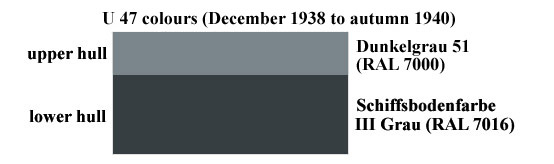 The upper hull colour (used upon the conning tower and the upper hull, above the waterline) at the start of U 47’s career was the medium blue-grey Dunkelgrau 51 (RAL7000, nearest FS match FS35237), the most common colour used in the U-boat fleet in early 1939. The division between the Dunkelgrau 51 on the upper hull and conning tower, and the dark grey anti-fouling paint Schiffsbodenfarbe III Grau on the lower hull, was slightly lower down during the earliest part of U 47’s career than was the case throughout the rest of the boat’s career.