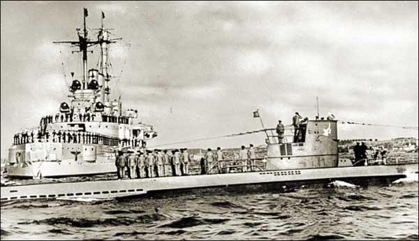 On the 23rd October, U 47 sailed past numerous battleships and cruisers moored in Kiel to celebrate the Scapa Flow mission. Crews of the Scharnhorst, Emden and the training ship Schleswig-Holstein paraded on deck in honour of the little U 47. This photo shows U 47 sailing past the training ship Schleswig-Holstein.