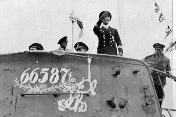 The Pillkoppen pennant is to the left of Prien’s outstretched arm. The two separate attachment points for the jumping wires are obvious in this photo. In 1938 and 1939, the jumping wires had been attached to the tower at only one point per side. Less obvious is the small fairlead at the trailing edge of the tower bulwark.