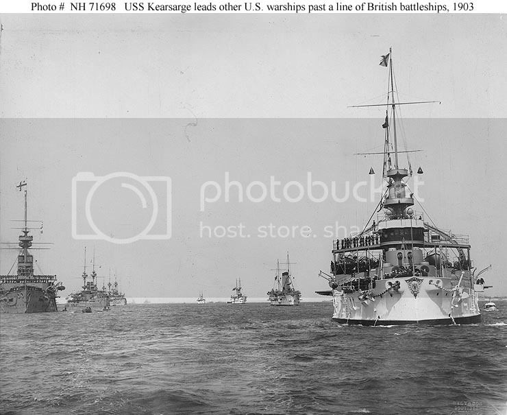 This is a picture of the USS Kearsarge leads ships of the U.S. European Squadron past a line of British Battleships, during a visit to an English port in 1903. The two ships immediately astern of Kearsarge are USS Chicago and USS San Francisco.