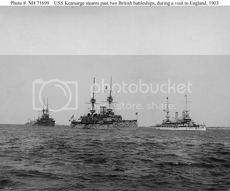 The USS Kearsarge steams past a pair of British Majestic class battleships, during a visit to an English port in 1903. Crewmen are manning the rails and superstructures of all three ships.