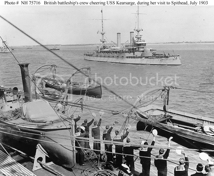 USS Kearsarge receives the cheers of crewmen on board a British battleship, during her visit to Spithead, England, in July 1903. USS Chicago is in the extreme left background.