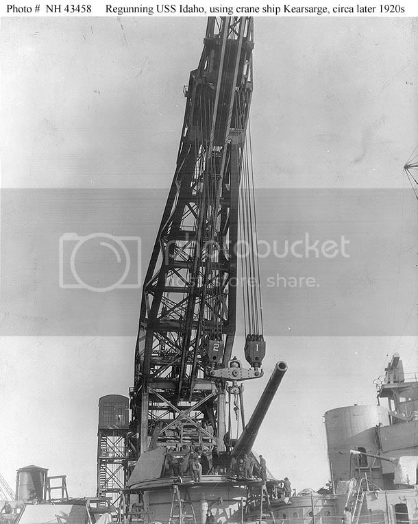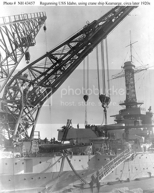 Another picture of the USS Idaho (BB-42) its 14"/50 gun is being lowered in to her second turret, during regunning at the Puget Sound Navy Yard, Bremerton, Washington, circa the later 1920s.