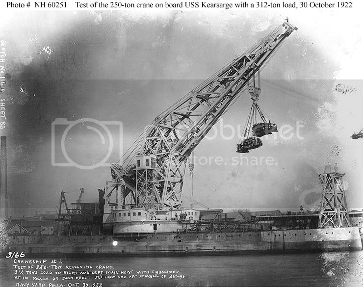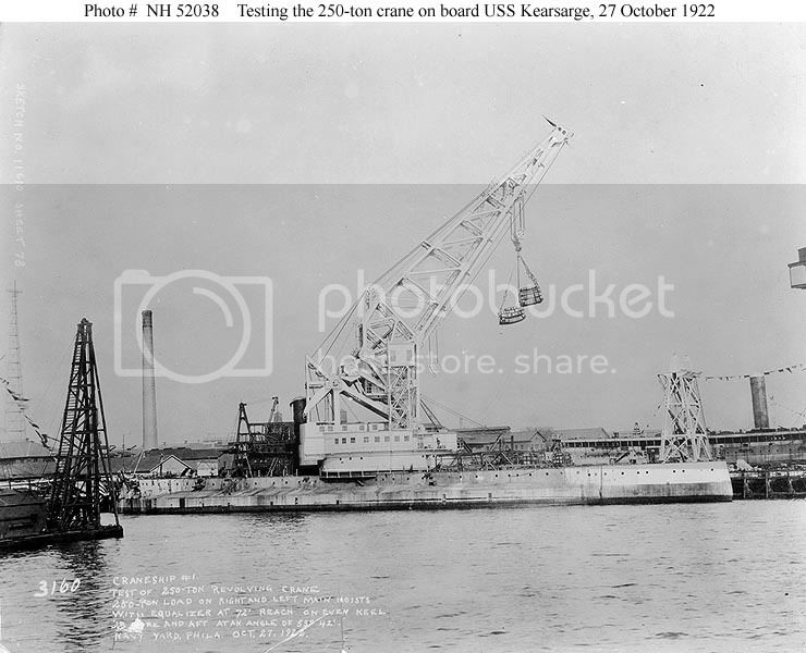 This is a picture of the testing of the ship's 250-ton revolving crane, at the Philadelphia Navy Yard, Pennsylvania, on 27th of October 1922. USS Kearsarge, which was still undergoing conversion at the time (note the incomplete superstructure ahead of the crane) is seen here lifting a 250-ton load on the right and left main hoists with equalizer at 72-foot reach on an even keel. Jib fore and aft at an angle of 53 degrees 42 minutes.