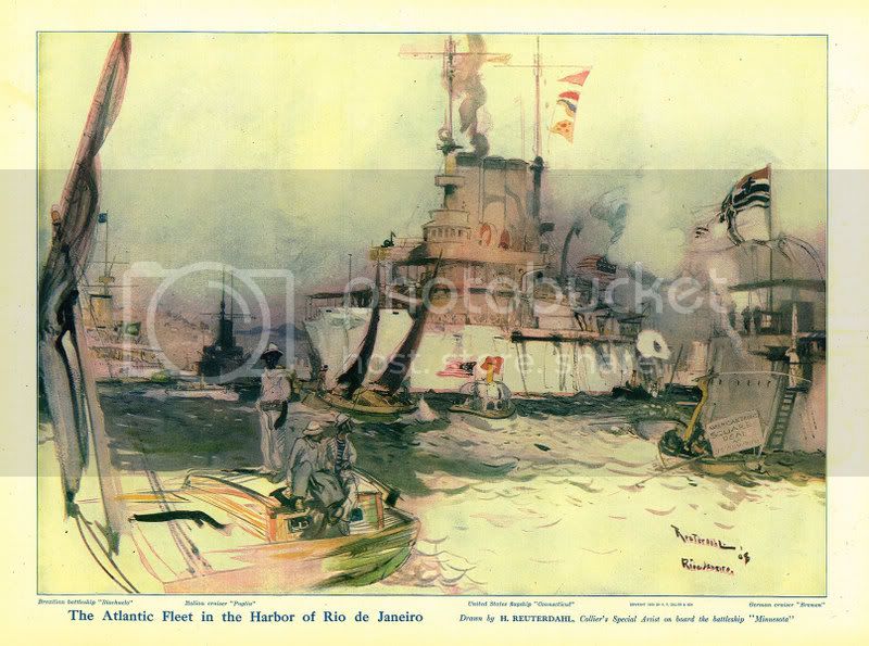 In viewing each of the images he painted from the Fleet's visits it is clear he was able to capture the excitement of the harbour and the atmosphere created by the arrival of the Fleet. The painting of the Minnesota in the harbour of Rio de Janeiro with the German cruiser Bremen can be compared to the photo by Brown and Schaffer of the harbour showing the same German cruiser to get some idea of the energy he was able to capture from the scene in the harbour.