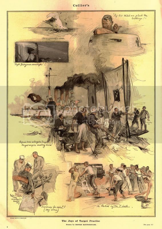 From the period during which the Fleet was at Magdalena Bay, Reuterdahl produced this series of water colors showing snapshots of the Joys of Target Practice. There for almost a month the Fleet's practice was something that I do not believe he was present for and he may have completed these illustrations possibly from photos after the Fleet arrived in California. From all accounts he had been put ashore in Punta Arenas, Chile for his McClure's article and could have only witnessed these events from the cargo ship he had gained passage on while it went north to California. His images of shipboard activity shows a keen understanding of shipboard life and the events associated with the lengthy target practices that must have seemed endless during the period they were in Magdalena Bay.