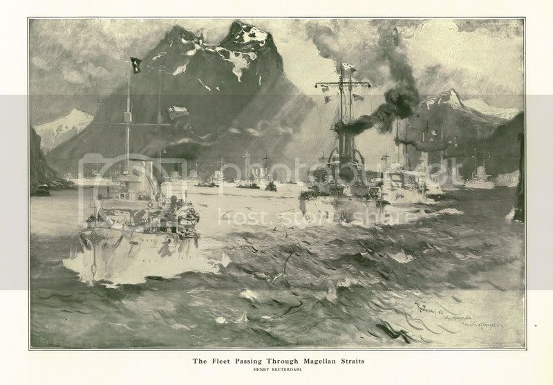 Though Henry's most famous image of the Fleet cruise is an oil painting of the Fleet though the Straits of Magdalena, here is a black and white print from a publication in 1914 of a watercolor.