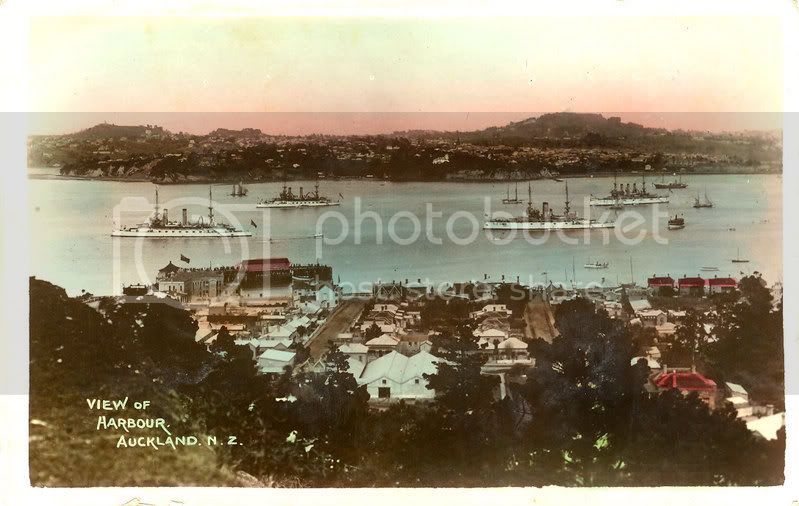 This is a picture of the mighty Great White Picture Fleet at anchor in Auckland
