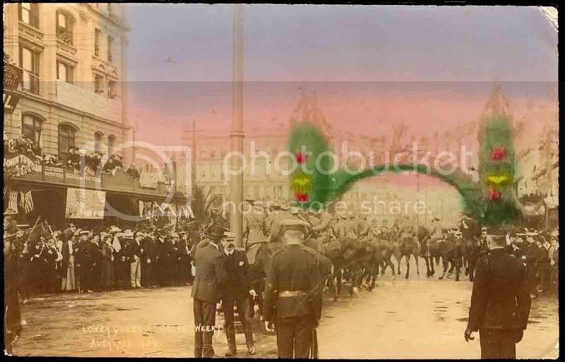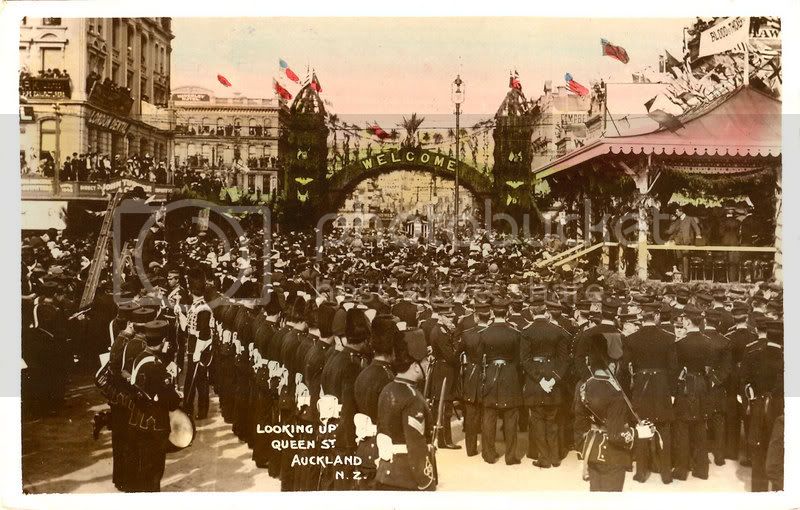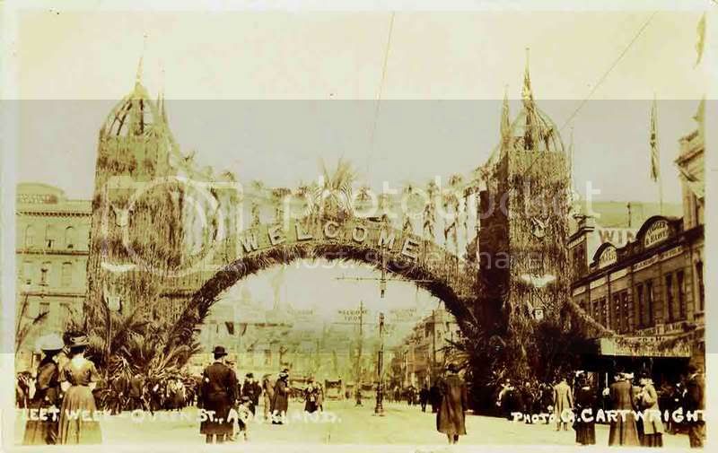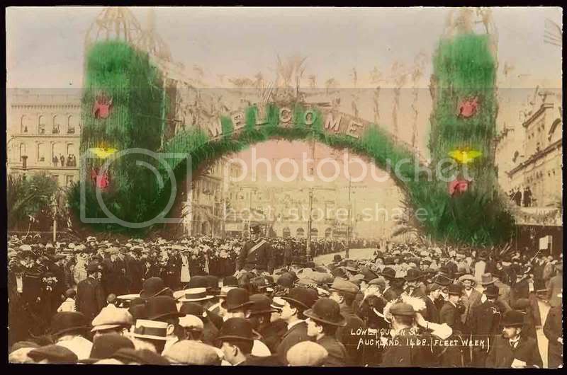 The welcome arch on lower Queen Street was one of the main attractions and gathering places during the fleet's visit to Auckland to meet sailors and watch them march past during the parade.