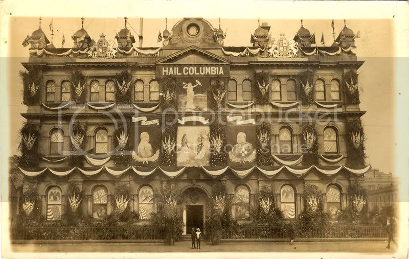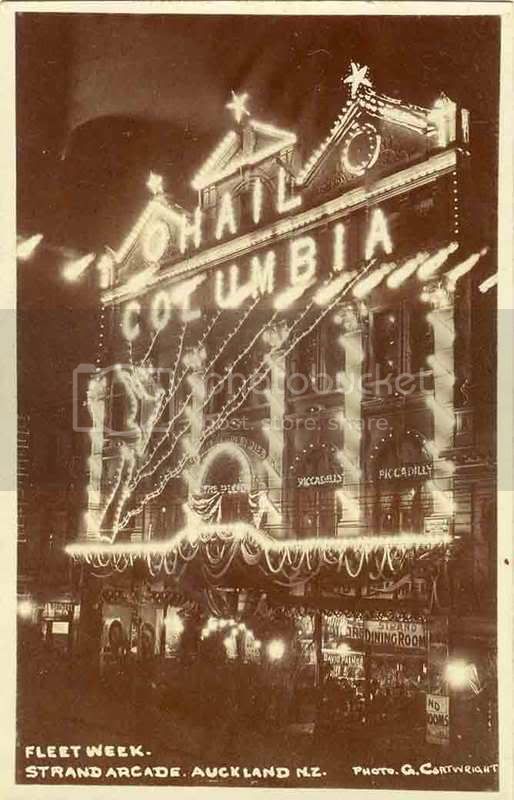 These buildings, decorated for the Fleet's visit, show the extent to which the City of Auckland went to greet the sailors of the American Fleet.