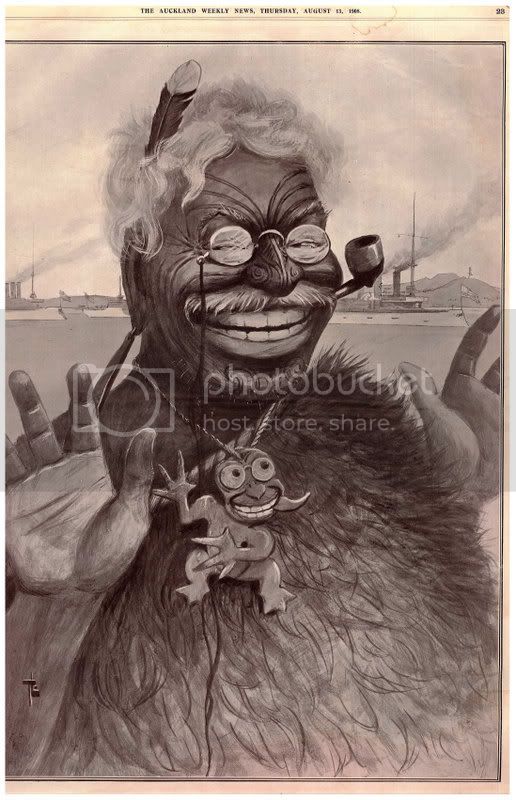 Admiral Sperry was part of the group that made the trip and at the conclusion of one of the dances, a tribesman bounded from the circle of dancers. Halting before the admiral and his staff, the Maori dancer broke into a broad, toothy smile and explained, "bully!" Even among these rustics in the outback of New Zealand, Roosevelt had made his mark, to the great surprise and amusement of Sperry and his staff. The chief had the Admiral dressed in Maori battle dress and described how the Maoris were seafaring people had sailed in canoes all over the Pacific.