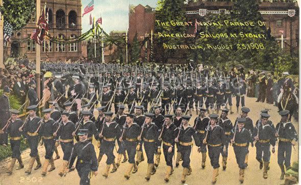 Landing a naval brigade at Fann Cove and Woolloomooloo Bay the next day, the Fleet marched up Pitt Street, renamed American Avenue for the occasion. They marched through the city to Mrs. Macquarine's Point where lunch was served.