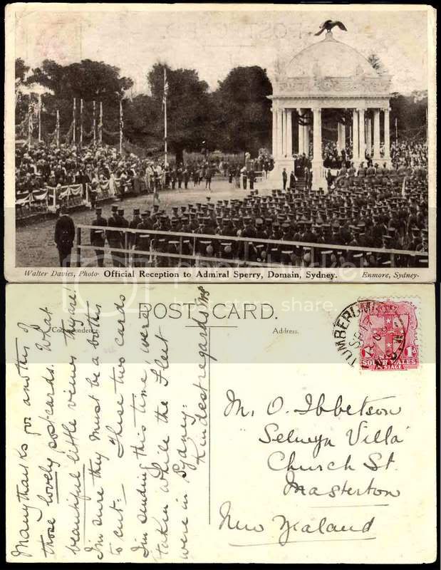 On the morning of Friday, August 21st, the official landing of the Admiral and his staff occurred at Farm Cove. A public reception was planned at the Domain where the Prime Minister, Mayor, and various state dignitaries greeted the American Fleet. Following the reception, a procession of the offices, sailors, and marines of the fleet proceeded through the city. Below is a picture of the reception at the Domain.