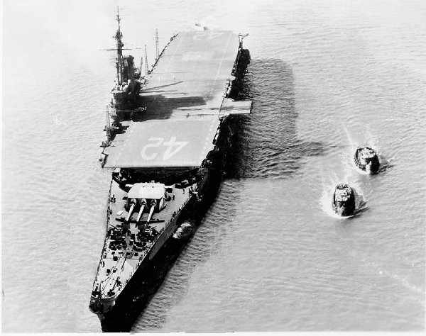 This plan, dated June 1942, represents the conversion of Iowa class battleship hulls. It would have produced a ship somewhat similar in external appearance to the Essex (CV-9) class, but with lower freeboard, only two aircraft elevators, one catapult, and an 864' long flight deck set well back from the bow.