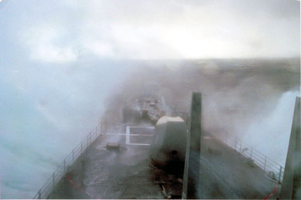 It wasn't until the next morning the full extent of the damage was discovered. We had lost several feet of railing on the forward section of the ship. The brass covers of the capstans were missing, these are big. There cracks all over the superstructure and above all of this the china in the ward room was all broken. One crack was in the top of a fuel tank that forms the bottom of a missile magazine. The helo hangar was effectively broken off the ship and was just sitting on board because it weighed so much. Several of the crew had cuts and bruises from falls. There was also a general messiness from things thrown from their shelves. Old salts claimed this was the worst storm they had been through. Several of the new guys were sick for a day afterward. The bridge crew reported green water over the bow. The rest of us have one heck of a story to pass along. And as they say about sea stories, you can tell its the truth because, I said so up front.