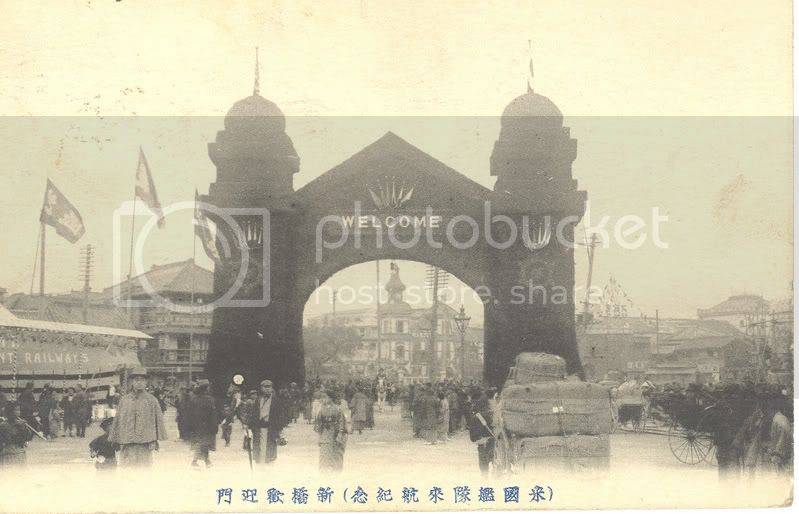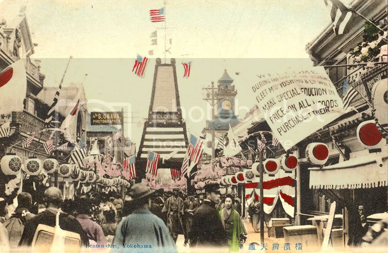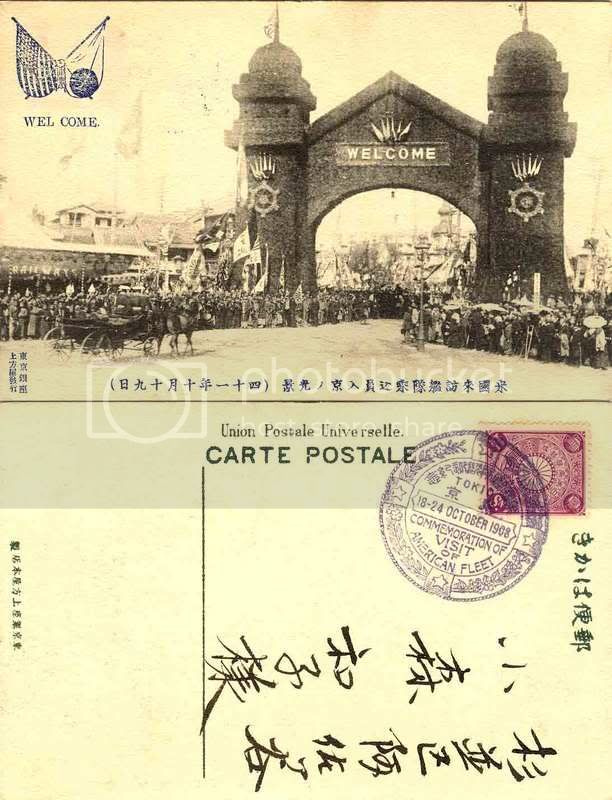 As Americans went ashore they were greeted with elaborate decorations on every street, parties, banquets, shows, and celebrations. Shown below is the American welcome arch shown with Admiral Sperry's parade carriage passing through. This postcard includes the commemorative cancel used by a Japanese citizen.