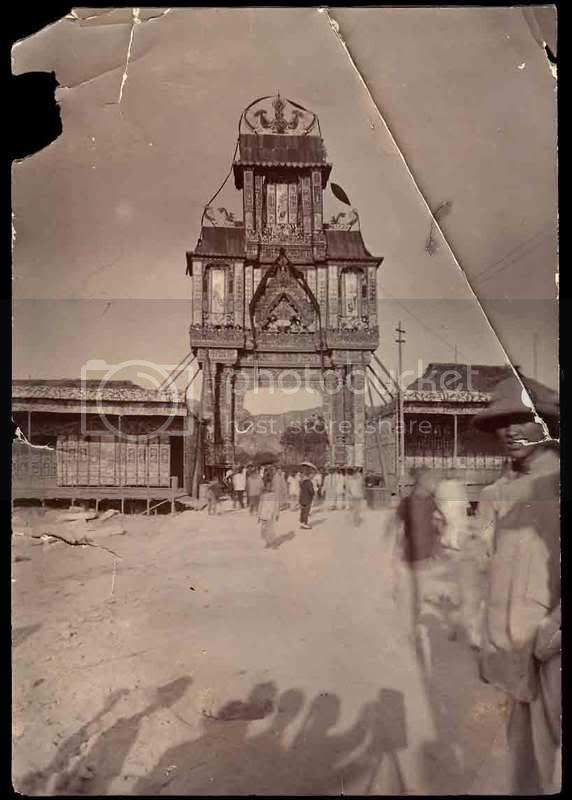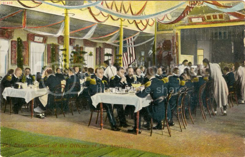 Officers of the Great White Fleet in Amoy, China, 1 November 1908. Adm William H. Emory, USN. Radm Seaton Schroeder, USN, Imperial Manchu Prince Yo Lang H.E, Sung Shou Viceroy were among the guests for the dinner held within the specially-built entertainment centre.