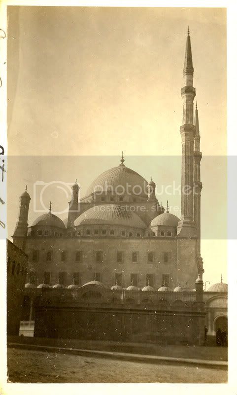 This is Tues. Dec 2 and I am still writing. Our stay in Port Said was not long enough for me to get a letter off so had to send postcards. We got back to the hotel at midnight and immediately turned in bed. The next morning we was up at 7 a.m. and had lunch. After lunch we went out inn front of the hotel where carriages was waiting for us to take us to the mosque and palace of one of Egypt’s great men who used to be Abraham Pasche. Was once ruler of Egypt and was succeeded by his son Ali Pasche. When Abraham Pashe died his son married his mother and put him in possession. There is a big long story attached to it and less I forget I will tell it to you some time. It certainly was a beautiful place. The carpet was velvet Brussels and the ceiling and walls with gold paintings or decorations. In some places the walls had gold inlaid and showed up something swell. I have sent you an interior view of the mosque so you can see what it is like. From the palace you can see the old Roman viaduct which was used or built by the Romans when they entered Egypt. After a short stay there we got into our carriages again and drove to another mosque where the topmbs of Abraham Pasche and his wife in the place. In another part is the tomb of Ali Pasche, his son, daughter and wife or mother. There was tombs there that to my idea cost quite a sum of money.