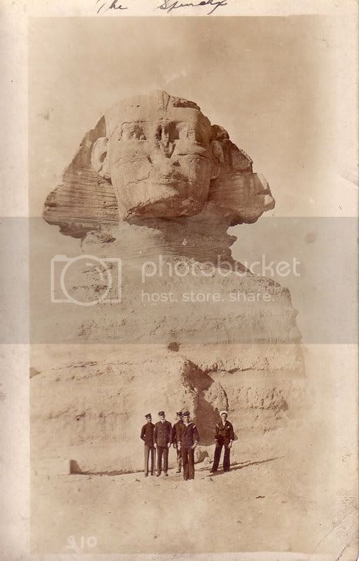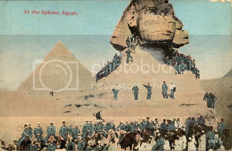 Many of the sailors rode the train out to see the pyramids. They swarmed over the Sphinx, which had it's nose shot off by Napoleon in 1798. They were photographed perched on all portions of the monuments having had their Bedouin guide assist them in climbing to all portions of the Sphinx for their photos.