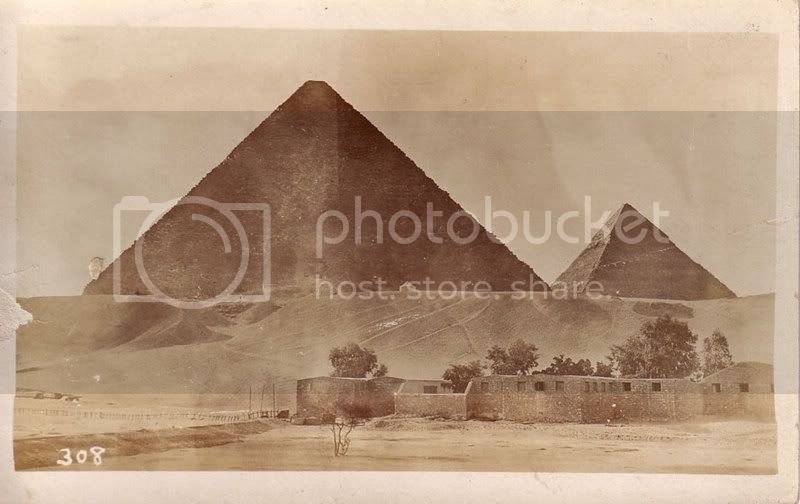 We soon got out and was on our way again. I forgot to say that we also stopped at the Mummy of Ramises II which is something worth seeing. Our only regret was we could not get into the museums in Cairo on account of it being a holiday. Our next stop was at the Sphinx but along the trail we passed several graveyards. At the Sphinx we had our picture taken. You will notice the face of the Sphinx is damaged up. I will tell you how that happened later. It is to long a story now. As soon as we had our picture taken we got underway to visit the Pyramids. One of these pyramids is 400 and some feet high while the other is 300 and some feet. After our sixteen mile ride across the desert we were all to tired to stop at the pyramids but instead went right on to the Mira House Hotel where we had breakfast (dinner) at 2 p.m. As soon as our meal was finished we gathered together outside and walked to the pyramids.