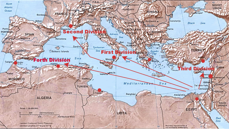 Meanwhile the Fourth Division was assigned to visit the ports of North Africa and the British facilities at Malta.