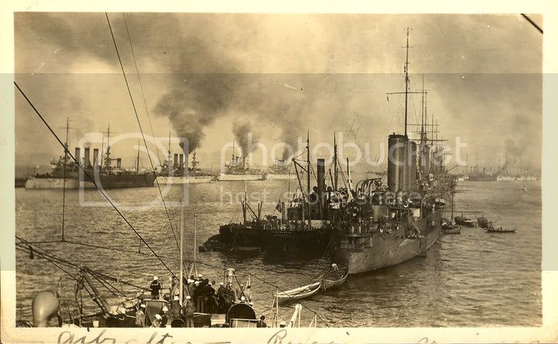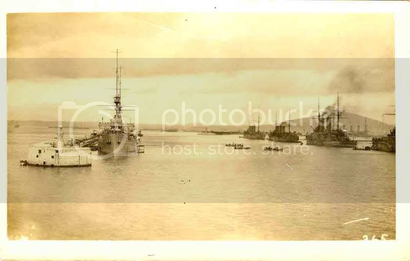 They arrived on January 31st, and the day being a Sunday, the normal salutes were not fired until the next day. For one hour next morning the port of Gibraltar seemed to be the scene of a naval engagement at close range. The USS Connecticut saluted the port and Vice-Admiral Sir James Goodrich, the commander of all the naval establishments at Gibraltar, with twenty-one guns, and when these had been returned, gun for gun, from a shore battery, and the British battleship Albemarle, and other salutes were fired to and answered by the Russian, French and Dutch warships in port.
