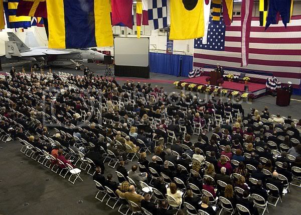 The events of the evening to mark the centennial of the Great White Fleet’s departure from Hampton Roads were reported as large and elaborate. The pictures of the evening certainly appear to confirm this. The evening started at 6:00p.m. onboard the USS Theodore Roosevelt (CVN-71) in the hangar deck with over 500 people in attendance.