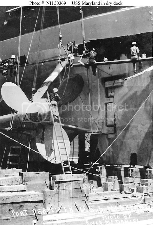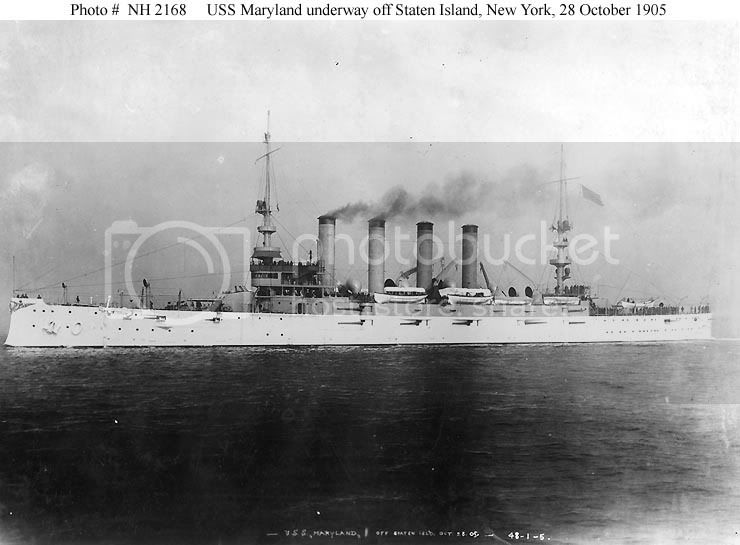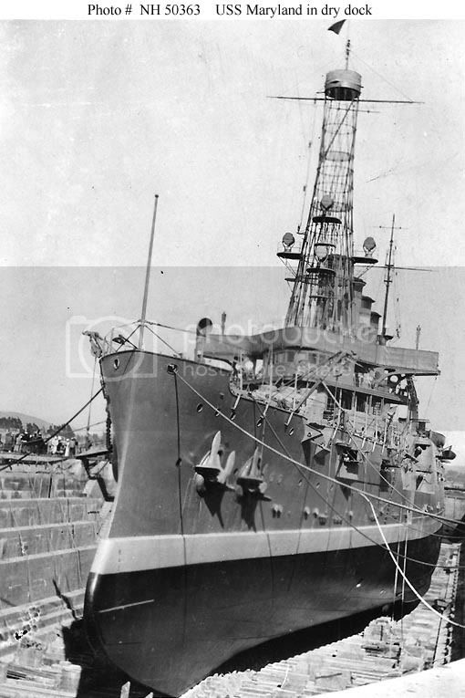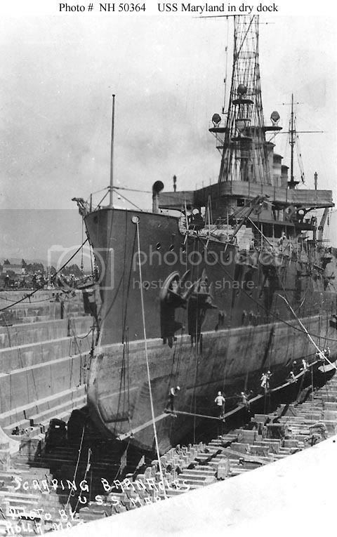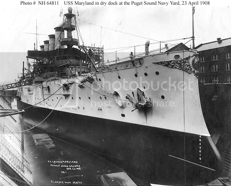 Here is a great picture of the Maryland in dry dock at Puget Sound navy yard, Bemerton, Washington on the 23rd of April 1908. Check out the freshly painted underwater hull and bow decoration.