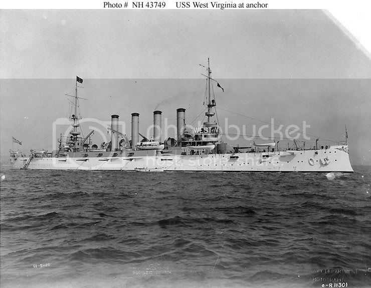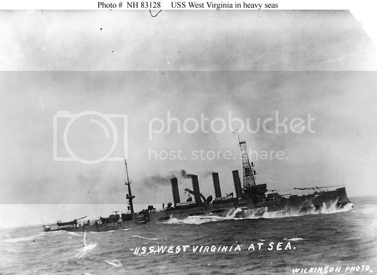 Here is a picture of the USS West Virginia underway at sea in 1918. Note her pattern camouflage, large wave breaking over her brow and coal smoke issuing from her funnels.